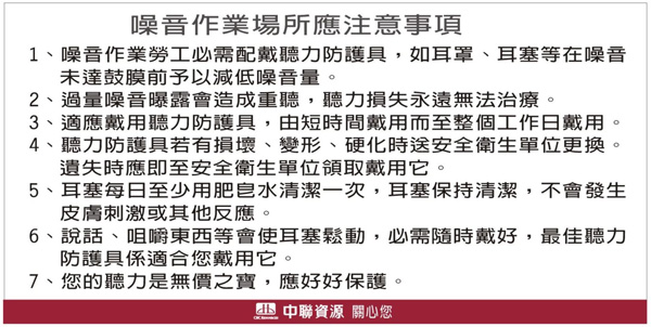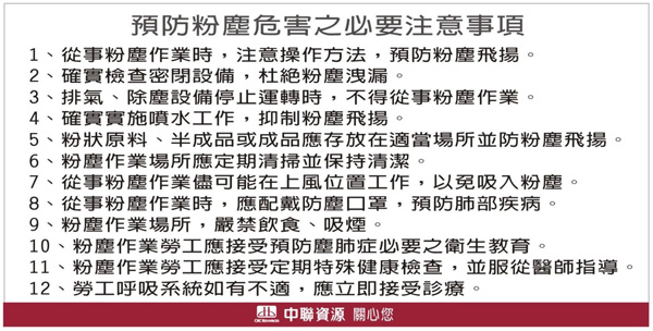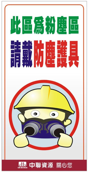 中聯資源工作場所主要為「噪音」及「粉塵」危害。依「職業安全衛生設施規則」及「粉塵危害預防標準」之要求,除定期實施「作業環境監測」外, 並按「職業安全衛生設施規則」進行相關標示。