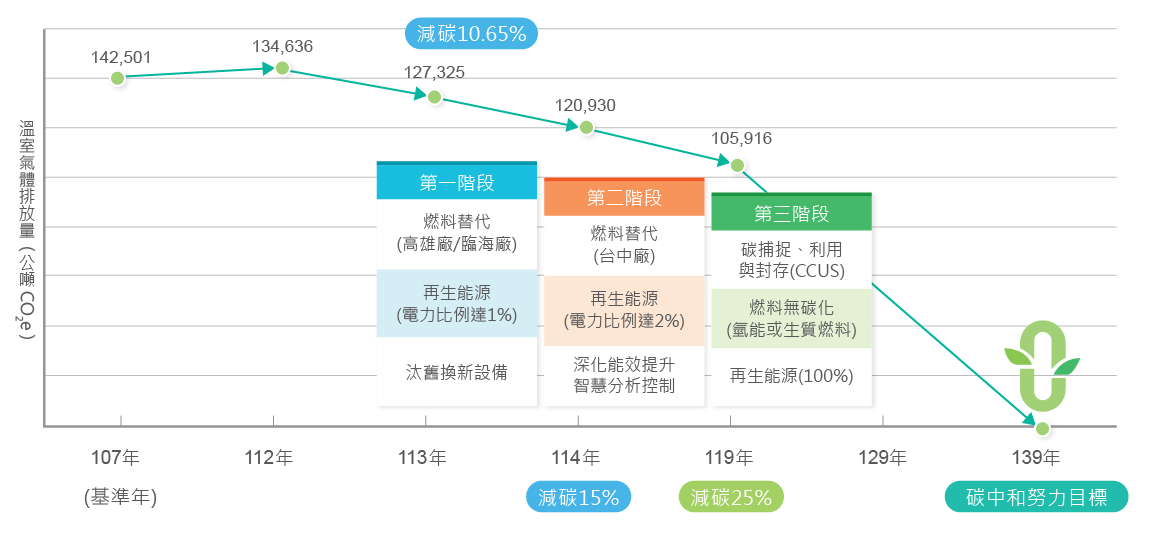 | 減碳目標 | 較民國107年排放量減15% | 較民國107年排放量減25% | 以達成碳中和為努力目標 |