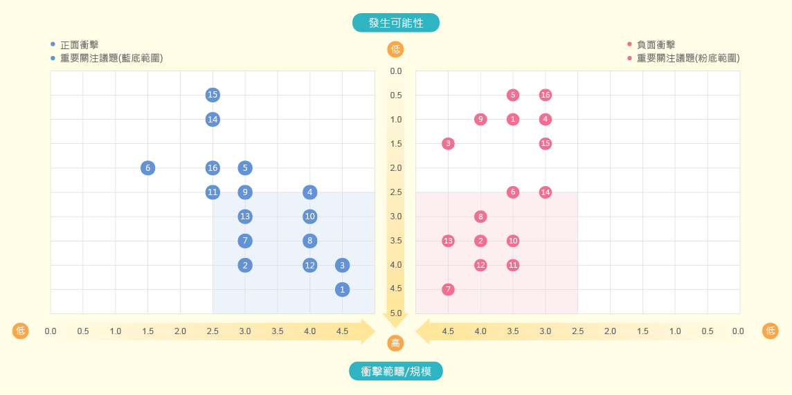 註2: 衝擊範疇/規模及發生可能性以0~5分作為評分標準,以2.5為基準,兩項得分皆達2.5分以上則列為重要關注議題。