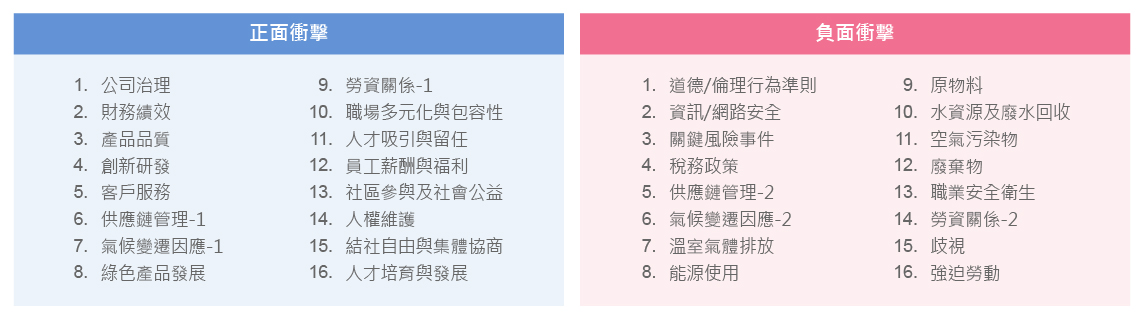 | 關注議題 | 正面衝擊 | 負面衝擊 | 衝擊範疇 / 規模 | 發生可能性 |