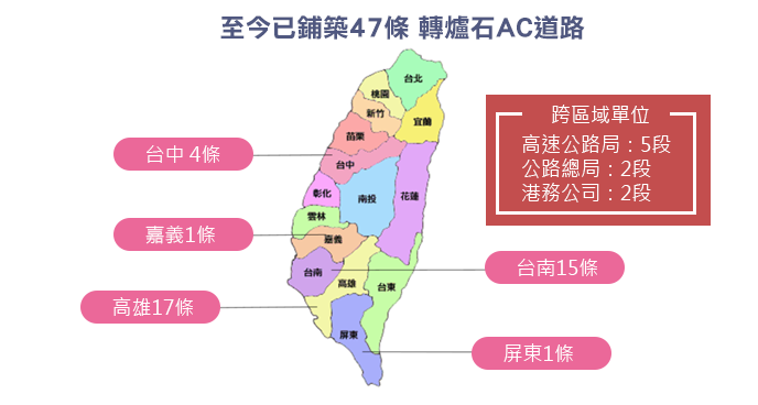 瀝青混凝土粒料產品轉爐石應用於瀝青混凝土相關之CNS國家標準已於2010.12.30全數公告,2012年已先後於屏東縣政府、國道高速公路局、高雄市政府、台南市政府及嘉義縣政府完成示範道路之鋪設,並於2014年推動將轉爐石瀝青混凝土納入各縣市政府之施工綱要規範中。並分別於2016及2017年成功將轉爐石納入高雄市與台中市施工規範,高雄市南星路轉爐石瀝青混凝土鋪面道路亦於2016年獲得國家金質獎之殊榮。2017年行政院工程會推動循環經濟,開始大規模將轉爐石AC骨材應用於公共工程,結至目前已完成47條轉爐石AC道路。