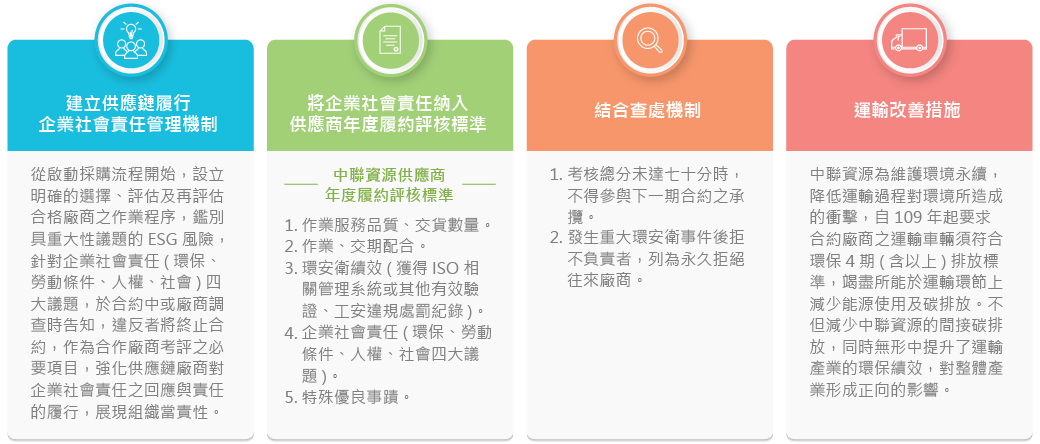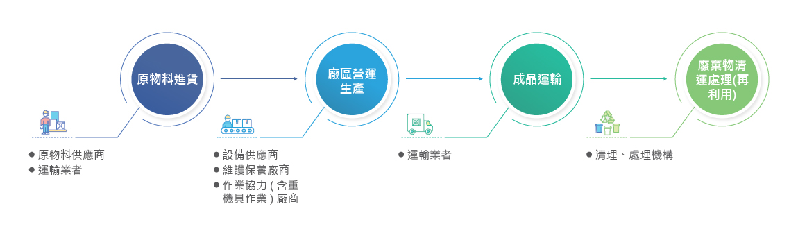 供應鏈組成中聯資源的供應鏈組成主要涵蓋產銷活動、物流運輸、原物料採購、維護保養及作業協力等相關供應商(承攬商),中聯資源運用積累的關鍵技術並建立管控機制來節省成本,藉此發揮各廠商的協作力量,優化運營效率,並致力於建立永續的供應鏈,進一步使中聯資源的產品成為推動循環經濟的關鍵。
