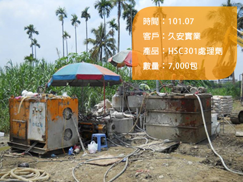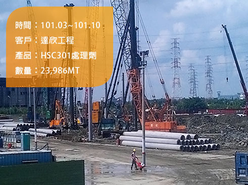 P6 of TSMC’s Fab 14 construction(Tainan Science Park), P5 of TSMC’s new plant construction(Tainan Science Park), New plant construction of MH GoPower Company Limited(Luzhu Science Park), New construction of Sin-Nan Elementary School(Tainan), New school building of Yuan Chong Elementary School(Chiayi County), Basic construction of silos, Lucky Cement Co. at Kaohsiung Harbor2. PIP (Packed In Place) pile grouting --