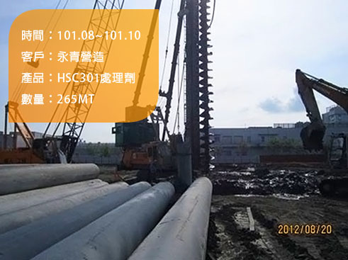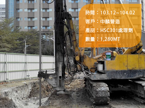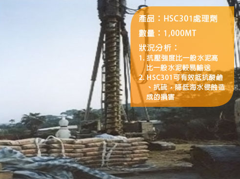 New residential buildings-China Prosperity Development Corporation, The Love River (Ai He) and Kaohsiung Train Station sections of the Kaohsiung Rapid Transit System, The Tucheng line tunnel (Yongning Station) of Taipei MRT, Nos. 3 and 4 Meinong River/ Tai He projects and the Disaster Prevention Project of the Meinong River embankments4. Cement mixing pile --