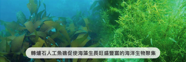 由於轉爐石等煉鋼爐石含有高含量的鈣質與鐵質成分,可持續釋出作為海藻的養分,藉此營造優良的海藻生存環境。國外如日韓等國將煉鋼爐石製成多種藻礁、人造石材等,依其功能特性安置於海床上,達成海洋藻床修復功能。隨著海藻旺盛的生長,隨之而來的就是豐富的海洋生物聚集,也因此營造了優良的漁場。