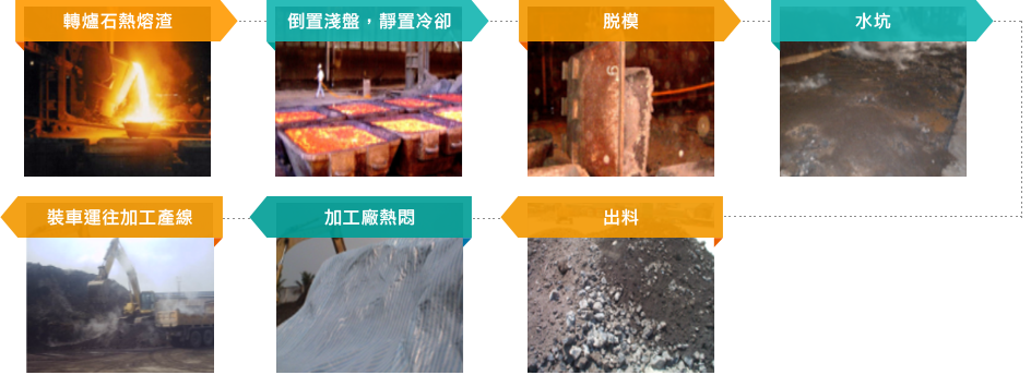 將1200℃高溫熔碴狀態的轉爐渣倒置於碴盤作初步冷卻,再將表面降溫的轉爐石運入水坑中熱悶,使轉爐石產生自然崩解粒化,以便取得低扁平顆粒型狀之轉爐石級配,簡稱「淺盤造塊熱悶崩解」,其特色為後續加工過程不再破碎,僅重複篩選加工即可取得不同粒徑規格的產品,同時材料具有強度高、粒料外觀方正與多稜角,特別適用於瀝青混凝土鋪面材料。