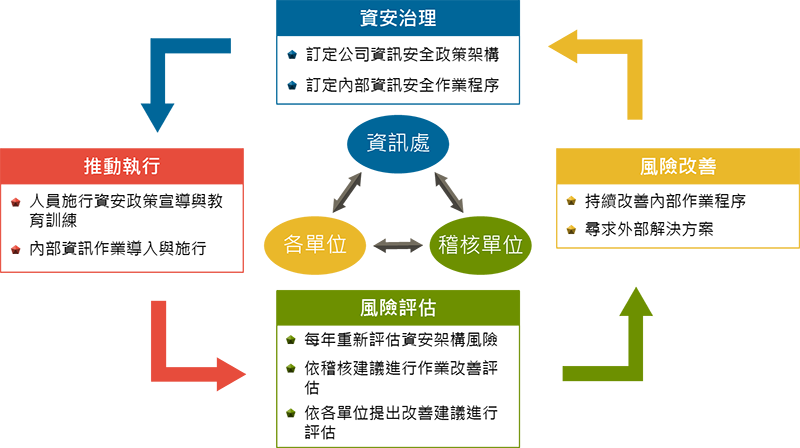 資安委員會設置編設共二十員,其中公告設立資安長、資安專責主管及資安專責人員(各1員),每年召開四次資安委員會議及一次管理審查會議及年底董事會資安執行成效報告,內部資安稽核每年一次,資安外部稽核每年一次經由PDCA不斷改善精進資安強度,每週實施資安社交工程演練及非公司授權軟體監測以強化同仁資安警覺及恪遵智慧財產之觀念;為了確認同仁對資安觀念之瞭解程度,資訊處每季實施資安認知線上評估測驗,藉由測評結果評估資安教育訓練成效,並做為後續資安課程相關規劃之參考。