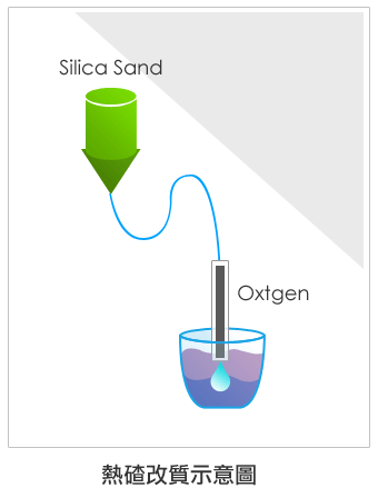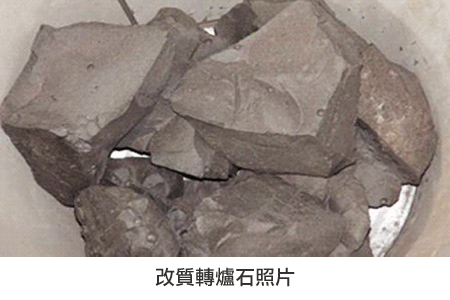 轉爐熱碴改質原理為轉爐剛倒出爐碴時,尚處於液態碴的狀態下,以噴吹管吹入氧氣繼續加熱碴溫(使FeO氧化為Fe2O3),並吹入矽砂或玻璃細粉等改質劑(受熱熔解),令其與游離CaO、MgO反應形成穩定的矽酸鹽化合物(2CaO+SiO2 → 2CaO‧SiO2),或與Fe2O3反應形成2CaO‧Fe2O3 (2CaO+Fe2O3 → 2CaO‧Fe2O3), 最後將轉爐石中的不安定成分予以消解。經過熱碴改質後的轉爐石其殘餘膨脹率<0.4%、游離CaO、MgO趨近於零,物理機械性質(如磨損率、硫酸鈉健度、加州承載比CBR、熱壓膨脹,摩氏硬度5.5~6.5)皆優於未改質之轉爐石與天然用粒料。改質轉爐石緻密度高,適合部分取代天然骨材用於非結構性混凝土(如消波塊、護坡塊、地磚…等)或鐵路道碴等工程材料。
