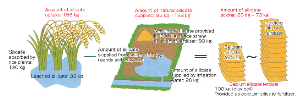 單位面積的稻田一般需要約156公斤的矽酸鹽,其中120公斤被水稻吸收、36公斤流失。而自然環境可提供的矽酸鹽大約是83~128公斤,包含土壤可提供5~50公斤、灌溉水可提供約28公斤、其他由稻稈或肥料可提供約50公斤。因此,整體而言,單位面積水稻耕作約缺乏28~73公斤的矽酸鹽,需要額外使用矽酸鈣肥料加以補充。